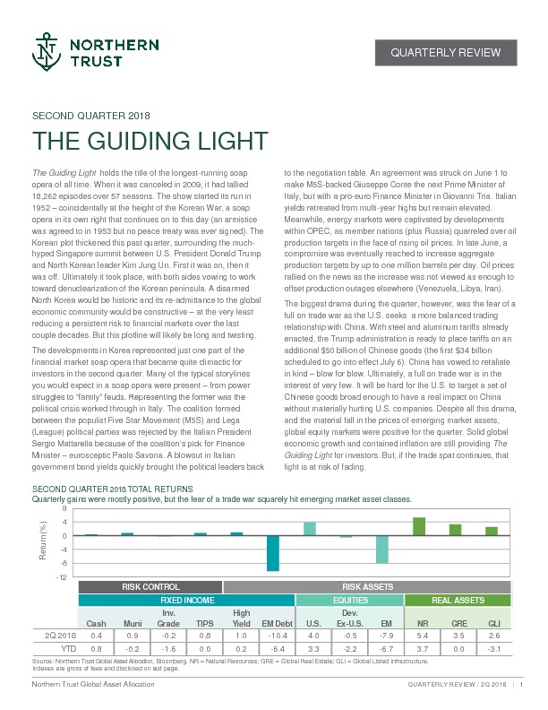 The Guiding Light holds the title of the longest - running soap opera of all time. When it was canceled in 2009, it had tallied 18,262 episodes over 57 seasons. The show started its run in 1952 – coincidentally at the height of the Korean War, a soap opera in its own right that continues on to this day (an armistice was agreed to in 1953 but no peace treaty was ever signed). The Korean plot thickened this past quarter, surrounding the much - hyped Singapore summit between U.S. President Donald Trump and North Korean leader Kim Jung Un. First it was on, then it was off. Ultimately it took place, with both sides vowing to work toward denuclearization of the Korean peninsula. A disarmed North Korea would be historic and its re - admittance to the global economic community would be constructive – at the very least reducing a persistent risk to financial markets over the last couple decades. But this plotline will likely be long and twisting.