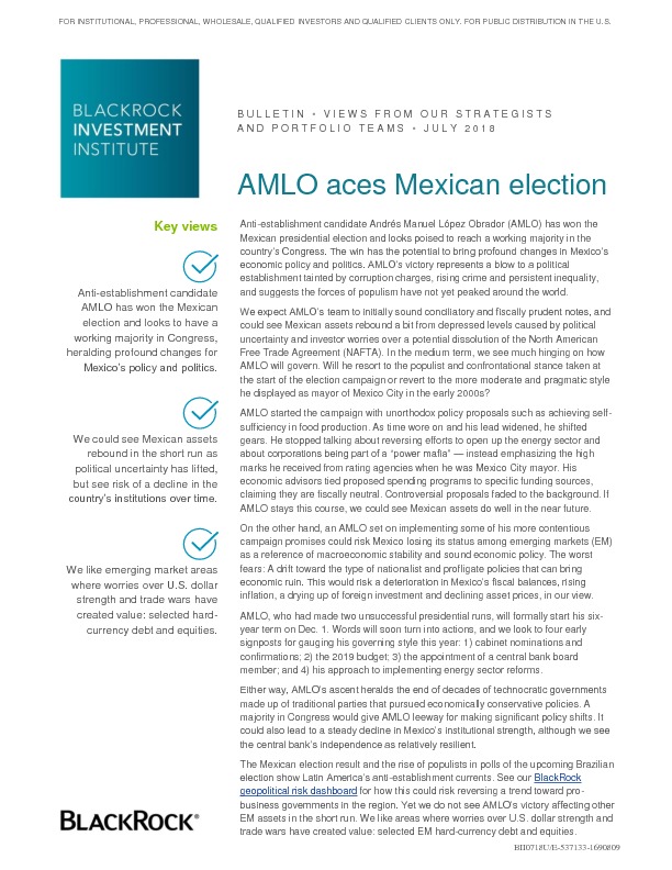 Anti-establishment candidate Andrés Manuel López Obrador (AMLO) has won the Mexican presidential election and looks poised to reach a working majority in the country’s Congress. The win has the potential to bring profound changes in Mexico’s economic policy and politics. AMLO’s victory represents a blow to a political establishment tainted by corruption charges, rising crime and persistent inequality, and suggests the forces of populism have not yet peaked around the world.