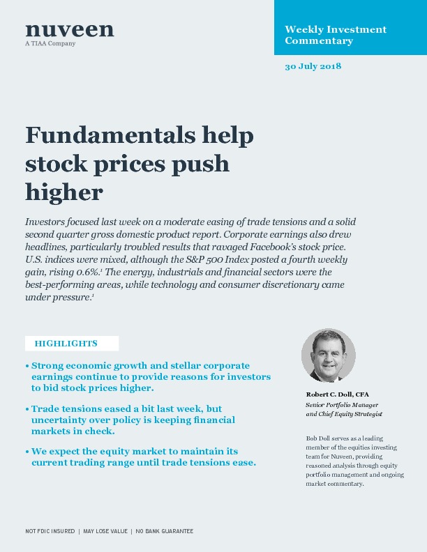 Investors focused last week on a moderate easing of trade tensions and a solid second quarter gross domestic product report. Corporate earnings also drew headlines, particularly troubled results that ravaged Facebook’s stock price. U.S. indices were mixed, although the S&P 500 Index posted a fourth weekly gain, rising 0.6%. The energy, industrials and financial sectors were the best-performing areas, while technology and consumer discretionary came under pressure.