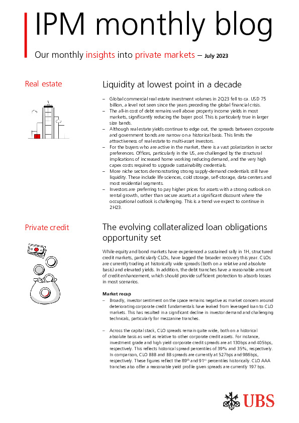Global commercial real estate investment volumes in 2Q23 fell to ca. USD 75 billion, a level not seen since the years preceding the global financial crisis. The all-in cost of debt remains well above property income yields in most markets, significantly reducing the buyer pool. This is particularly true in larger size bands. Although real estate yields continue to edge out, the spreads between corporate and government bonds are narrow on a historical basis. This limits the attractiveness of real estate to multi-asset investors.