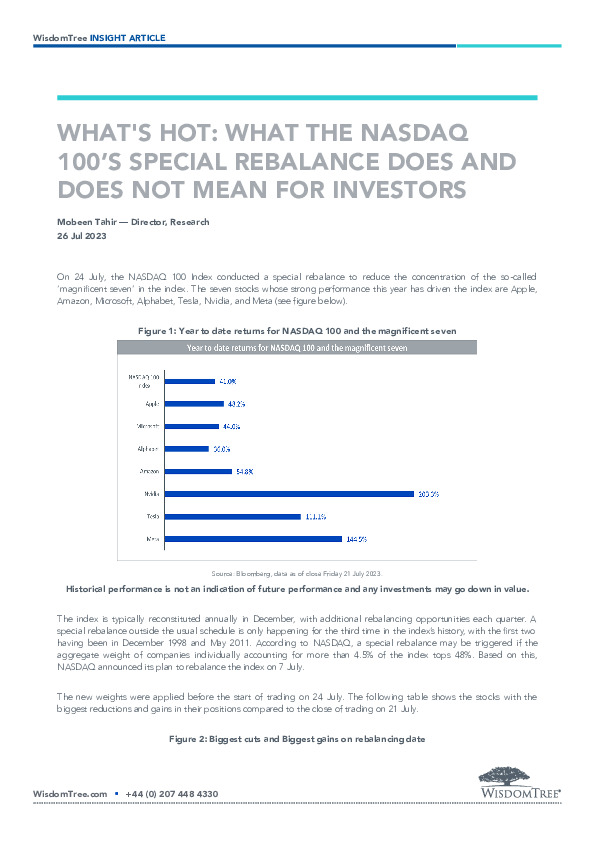 On 24 July, the NASDAQ 100 Index conducted a special rebalance to reduce the concentration of the so-called ‘magnificent seven’ in the index. The seven stocks whose strong performance this year has driven the index are Apple, Amazon, Microsoft, Alphabet, Tesla, Nvidia, and Meta.