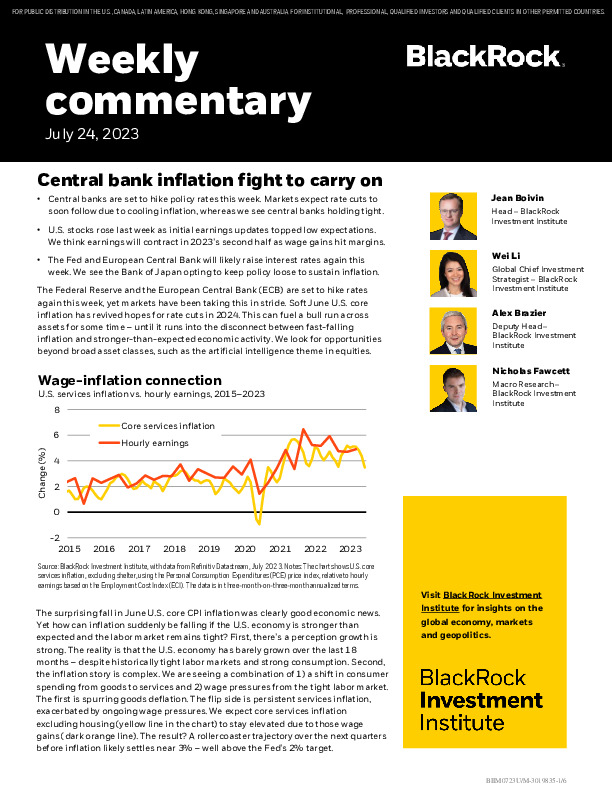 Central banks are set to hike policy rates this week. Markets expect rate cuts to soon follow due to cooling inflation, whereas we see central banks holding tight. U.S. stocks rose last week as initial earnings updates topped low expectations. We think earnings will contract in 2023’s second half as wage gains hit margins. The Fed and European Central Bank will likely raise interest rates again this week. We see the Bank of Japan opting to keep policy loose to sustain inflation.