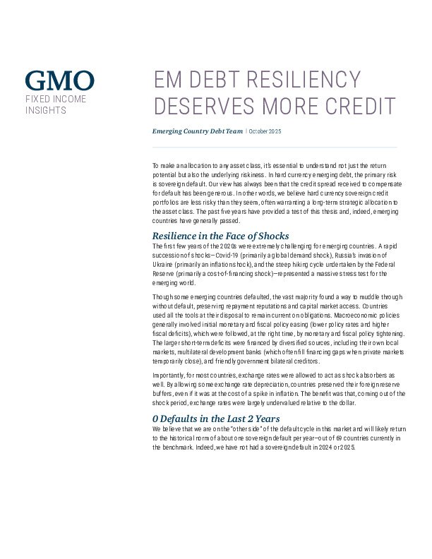 GMO’s Fixed Income Insights (Oct 2025) argues that hard currency emerging market (EM) debt continues to deliver attractive risk-adjusted returns despite recent shocks.