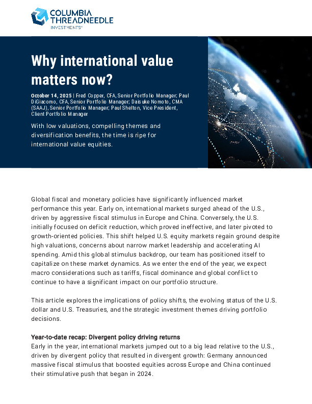 Columbia Threadneedle’s Overseas Value Insight (Oct 2025) argues that global macro dynamics now favor value opportunities outside the U.S.