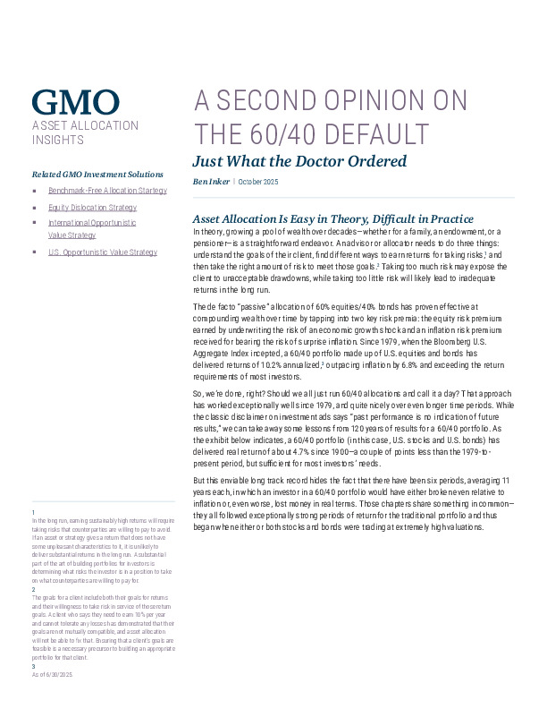 In A Second Opinion on the 60/40 Default (Oct 2025), Ben Inker of GMO argues that investors relying on traditional stock/bond portfolios may face disappointing returns in today’s high-valuation environment.