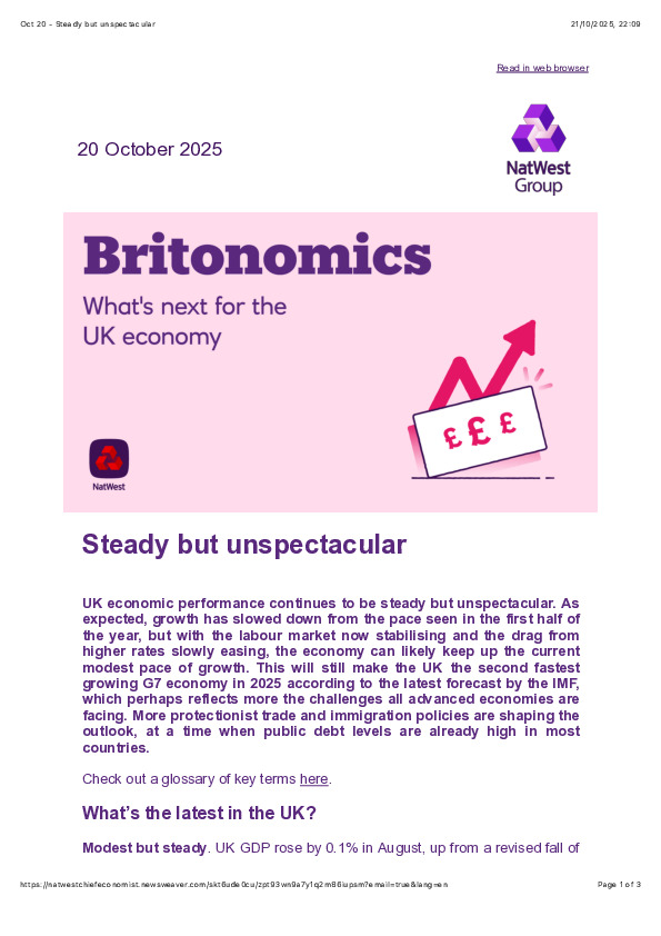 NatWest’s Steady but Unspectacular (20 Oct 2025) highlights a UK economy maintaining modest growth amid easing rate pressures and stabilising labour conditions.