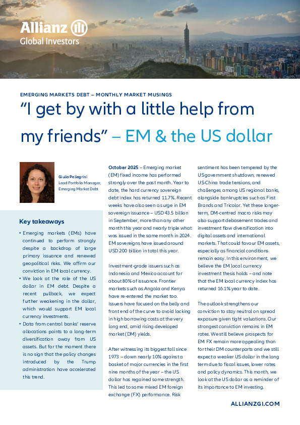 Allianz Global Investors’ EMD Monthly Market Musings (Oct 2025), led by Giulia Pellegrini, reviews why emerging markets continue to deliver solid performance despite geopolitical and issuance headwinds.