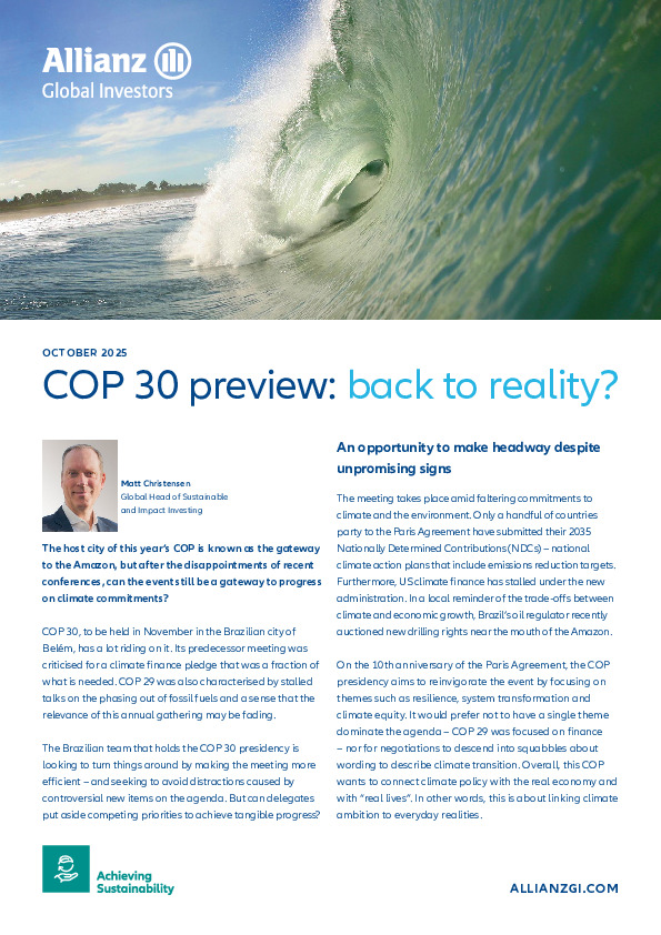 Matt Christensen, Global Head of Sustainable and Impact Investing at Allianz Global Investors, previews COP 30, where expectations are high for renewed progress on climate action amid fading global momentum.