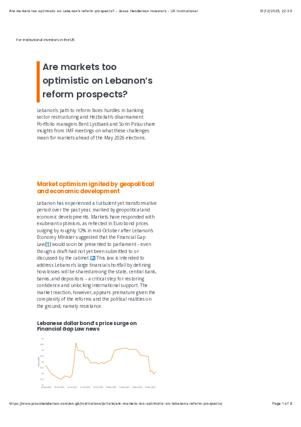 This analysis examines why market enthusiasm for Lebanon’s Eurobonds may be outpacing the political and institutional capacity to deliver credible reform