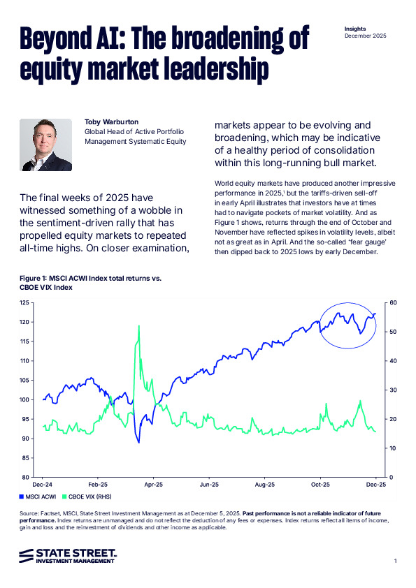 State Street Investment Management examines how the AI-led rally is evolving, with market leadership gradually diffusing across regions, sectors and factors as the cycle matures.