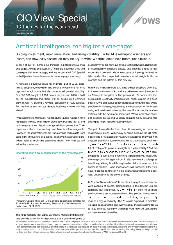 DWS’s CIO Special frames artificial intelligence as a structural growth engine entering a more volatile, capital-intensive phase that will increasingly separate durable winners from fragile narratives.