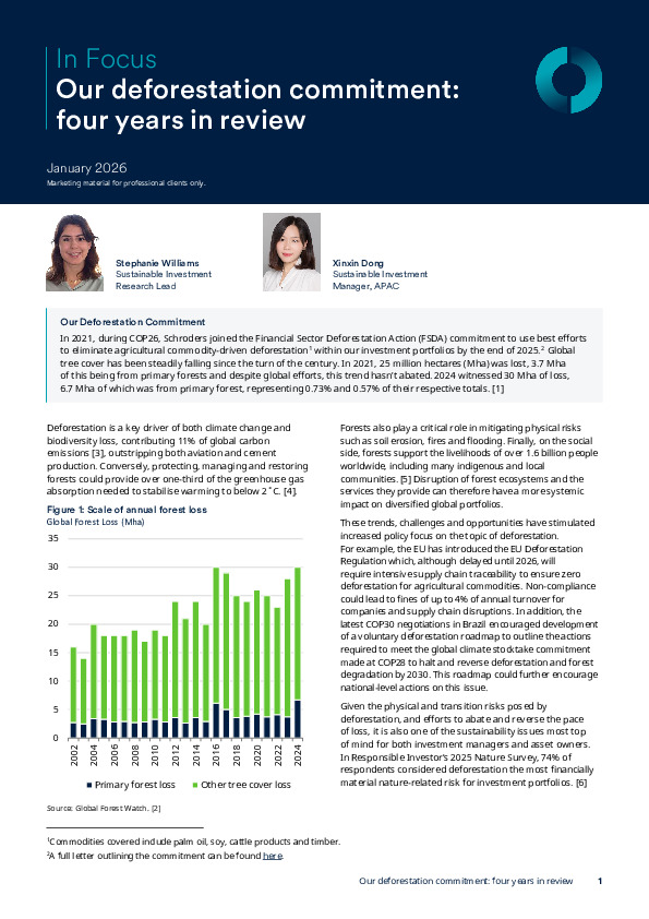 Prepared by Schroders’ sustainable investment team, led by Stephanie Williams and Xinxin Dong, the paper reviews four years of portfolio action under its deforestation commitment and the implications for investment risk management.
