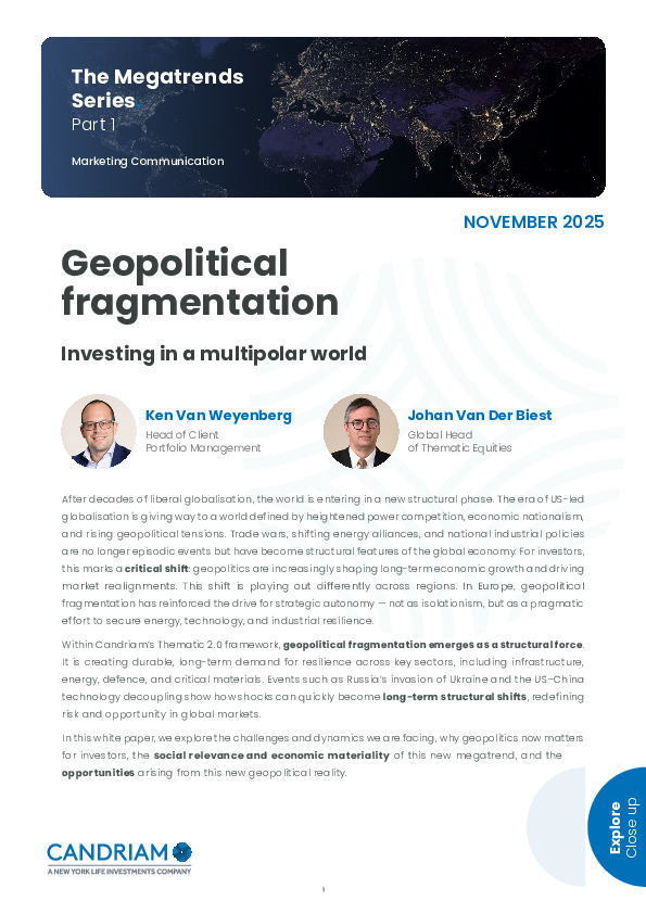 Candriam’s Megatrends Series paper by Ken Van Weyenberg and Johan Van Der Biest explains how US-led globalisation is giving way to lasting fragmentation reshaping growth, supply chains and sector leadership.
