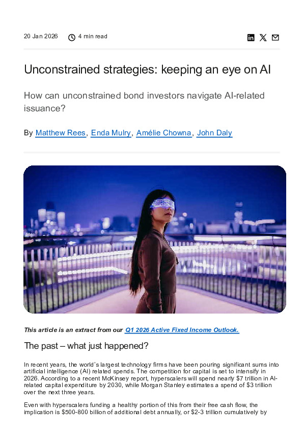 L&G’s Matthew Rees, Enda Mulry, Amélie Chowna and John Daly outline how unconstrained bond investors can navigate a looming wave of AI-linked issuance and its spread implications.