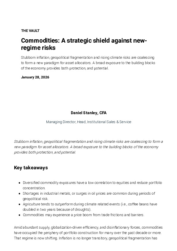This report, authored by Daniel Stanley, CFA, of BMO Global Asset Management, evaluates the renewed strategic role of commodities amid shifting macroeconomic conditions