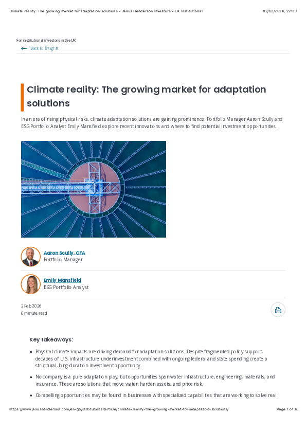 The featured report by Janus Henderson Investors, this report assesses how rising physical climate risks are translating into a long-duration market opportunity focused on adaptation rather than mitigation.