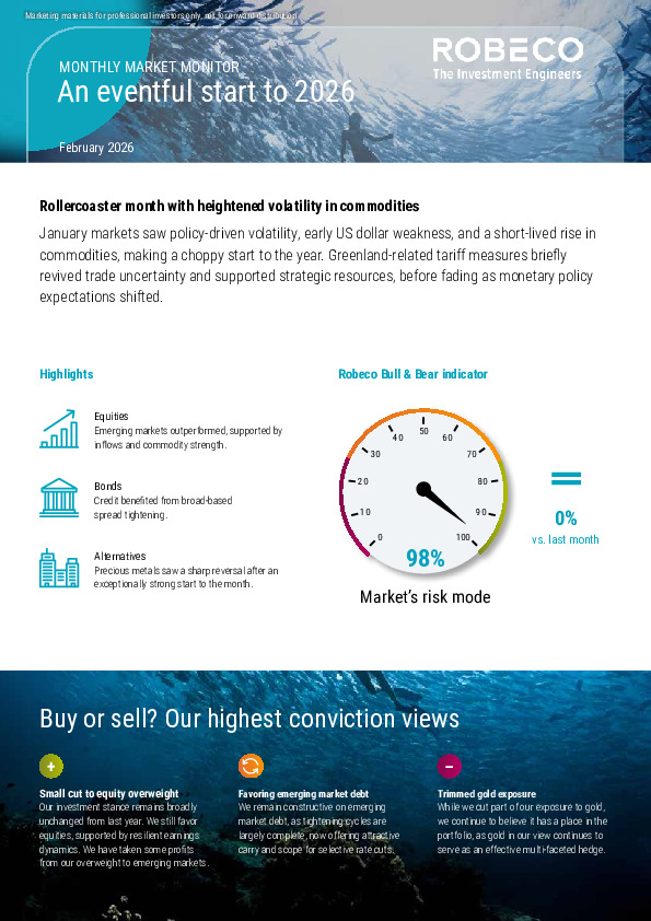 After a turbulent start to the year, Robeco’s February Market Monitor assesses how portfolios are being recalibrated amid policy noise, commodity swings, and resilient fundamentals.