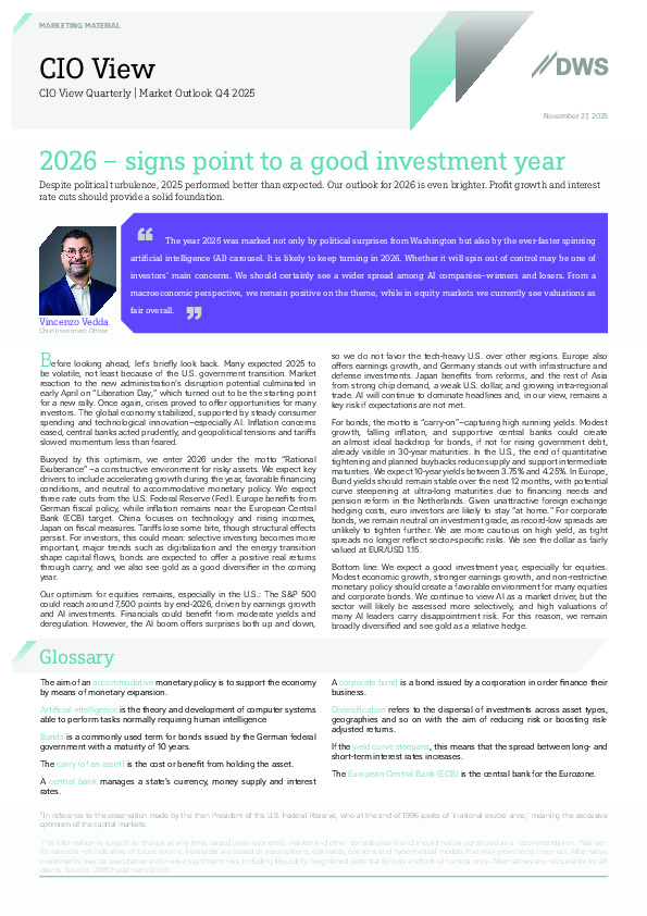 DWS CIO Vincenzo Vedda’s Q4 2025 outlook argues that resilient growth, moderating inflation and rate cuts create a constructive backdrop for risk assets in 2026