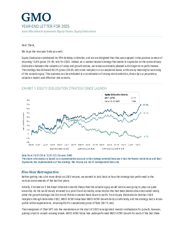 GMO’s year-end letter argues that extreme value–growth dispersion remains intact, sustaining the opportunity set for its market-neutral Equity Dislocation strategy