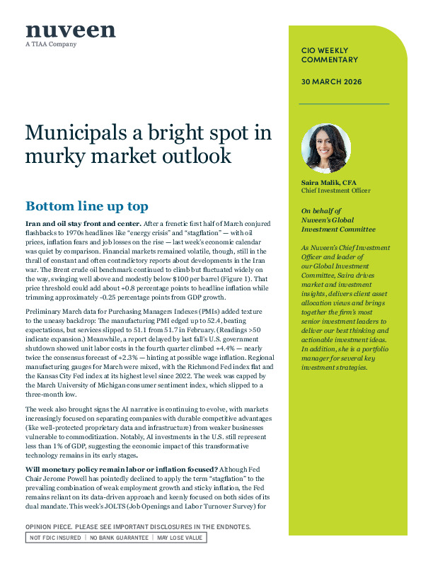 Nuveen argues that in a market dominated by oil volatility, inflation fears and slowing growth, municipal bonds are emerging as one of the cleaner relative opportunities.