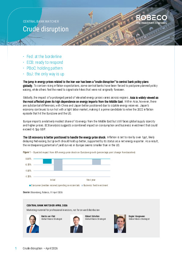 Robeco’s April Central Bank Watcher argues the Iran war has become a global monetary policy shock, forcing central banks to delay easing plans and reconsider inflation risks through the energy channel.
