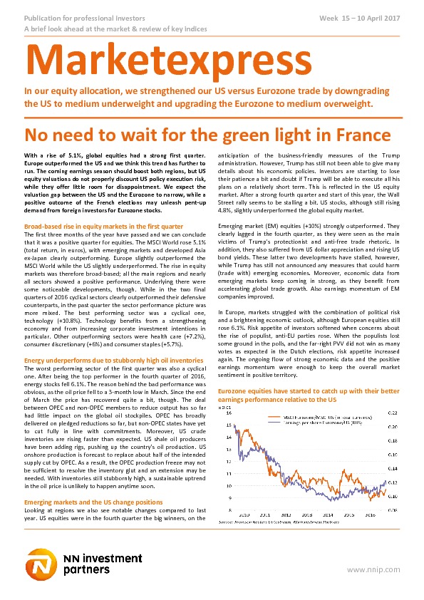 With a rise of 5.1%, global equities had a strong first quarter. Europe outperformed the US and we think this trend has further to run. The coming earnings season should boost both regions, but US equity valuations do not properly discount US policy execution risk, while they offer little room for disappointment. We expect the valuation gap between the US and the Eurozone to narrow, while a positive outcome of the French elections may unleash pent-up demand from foreign investors for Eurozone stocks.