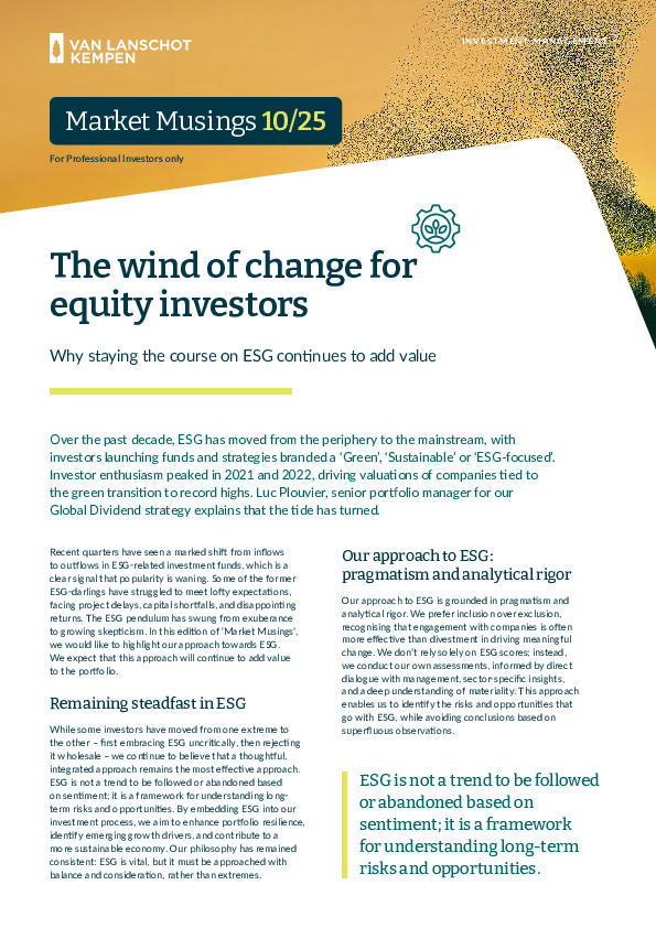Van Lanschot Kempen’s Market Musings – Wind of Change (Oct 2025) explores how ESG investing is maturing beyond hype toward balanced, evidence-based application.