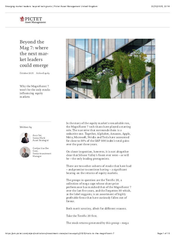Pictet Asset Management’s Emerging Market Leaders: Beyond Tech Giants (Oct 2025) challenges the notion that U.S. megacaps will dominate equity performance indefinitely.