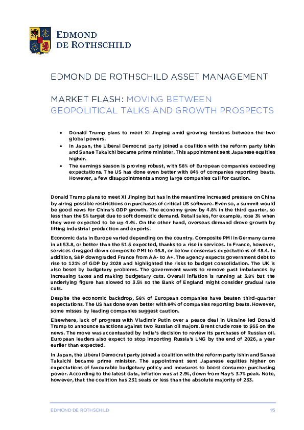 Edmond de Rothschild’s Market Flash (24 Oct 2025) reflects on a week where geopolitics, earnings, and macro data pulled in different directions.