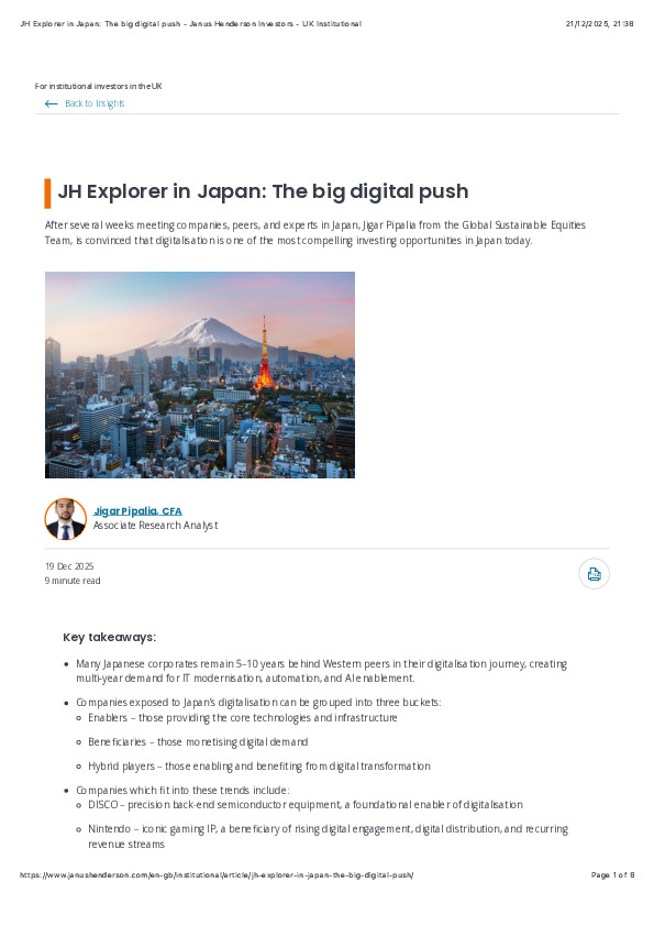 Janus Henderson’s latest field research highlights how chronic underinvestment, legacy systems and demographic pressures are accelerating Japan’s push toward digitalisation.