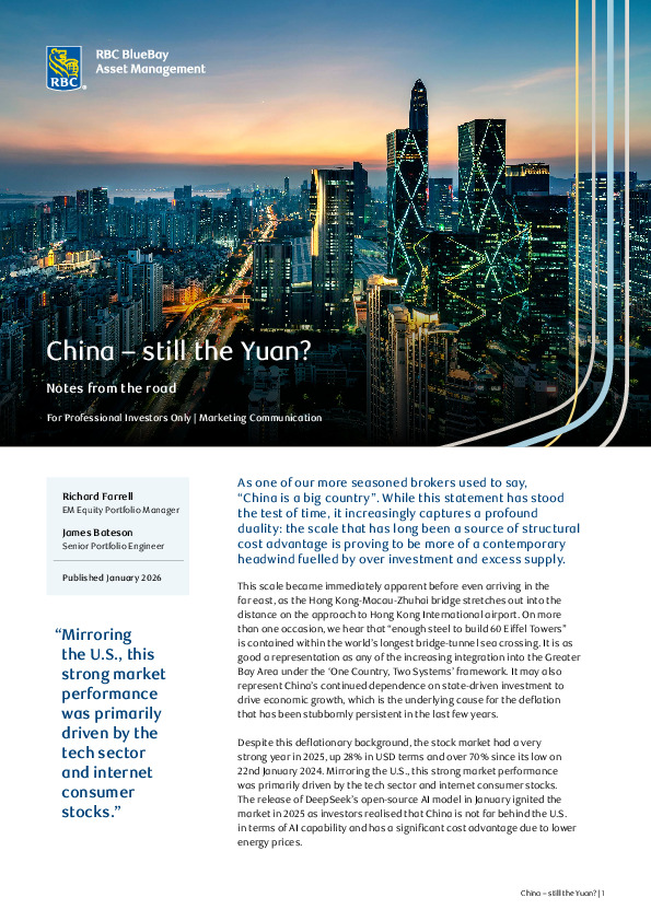 This report by Richard Farrell and James Bateson of RBC BlueBay Asset Management assesses China’s equity landscape following on-the-ground research across key regions