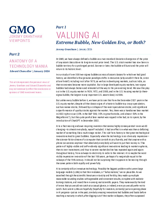 The featured report, authored by Jeremy Grantham and Edward Chancellor of GMO, examines whether today’s AI boom represents a durable economic shift, an extreme asset bubble, or both.