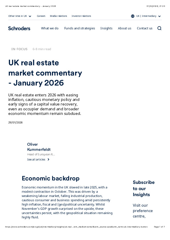 Early-2026 conditions point to a tentative recovery phase for UK real estate, shaped by easing inflation, cautious rate cuts, and selective investor re-engagement, based on analysis by Schroders’ UK real estate team.