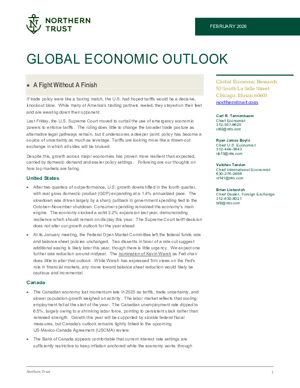 The featured global outlook contends that tariffs are evolving into a prolonged drag on confidence rather than a decisive lever, even as growth proves resilient