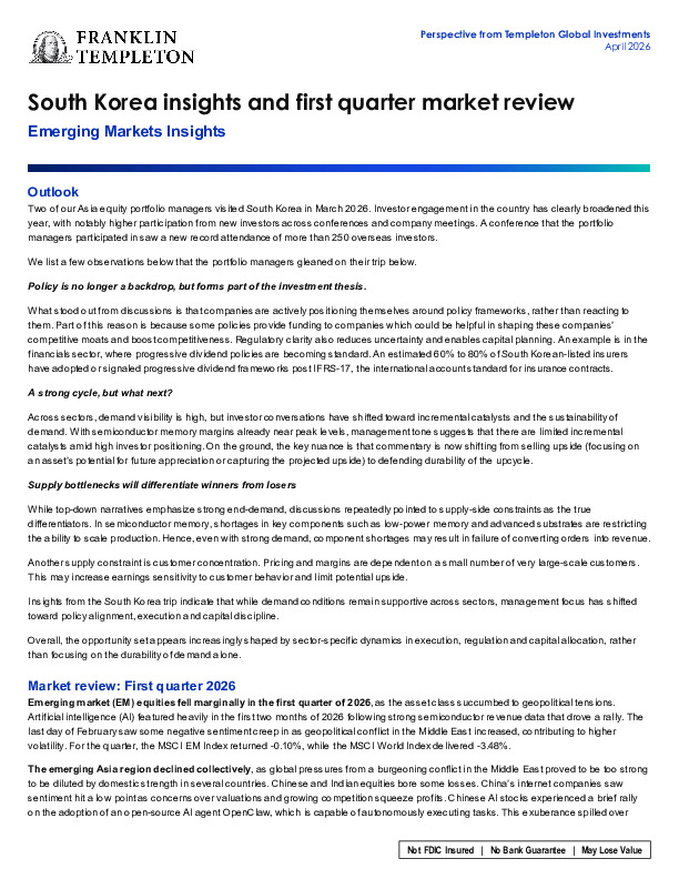 Templeton’s April emerging markets note suggests South Korea remains one of the cleaner AI and policy-linked stories in Asia, though investors are now shifting from chasing upside to testing durability.
