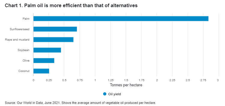 There are alternatives to palm oil, but none share its unique characteristics and productive efficiency. Its fruit yields at least four times more oil than other plant sources (see chart 1). This makes it hard to replace. Alternatives such as soya are also linked to deforestation, but their lower yield per hectare mean that even more trees are at risk.